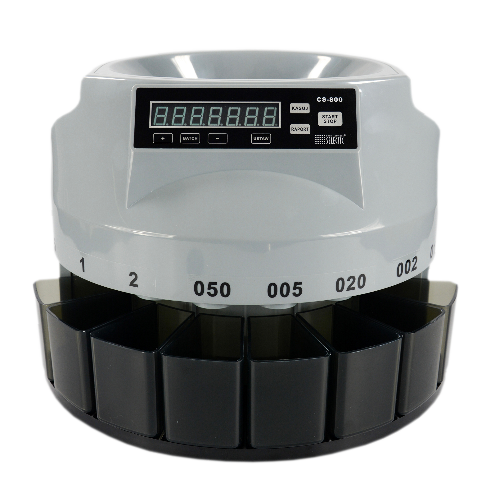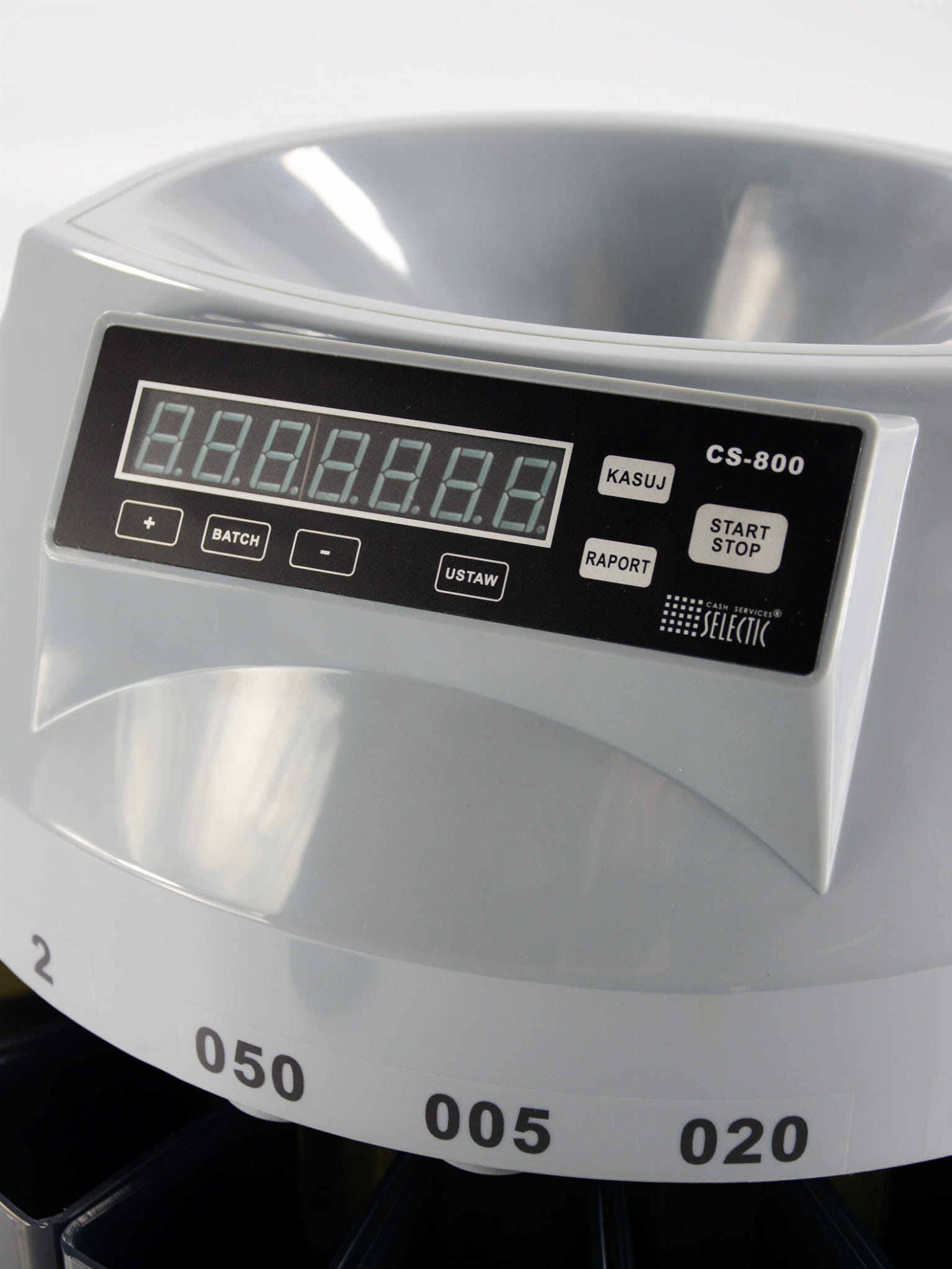 Dzięki czytelnym przyciskom w języku polskim oraz siedmiocyfrowemu wyświetlaczowi LED obsługa urządzenia jest intuicyjna i nie wymaga długiego szkolenia. Sorter oferuje tryb liczenia ciągłego oraz funkcję odliczania zadanej ilości monet w trybie BATCH, co pozwala precyzyjnie przygotować określone kwoty do rozliczeń, kasetek lub worków depozytowych. Regulowana pojemność odbiorników umożliwia dopasowanie pracy urządzenia do różnych nominałów i intensywności użytkowania.